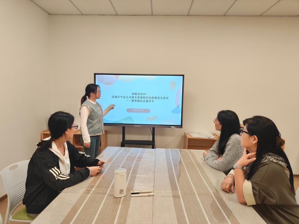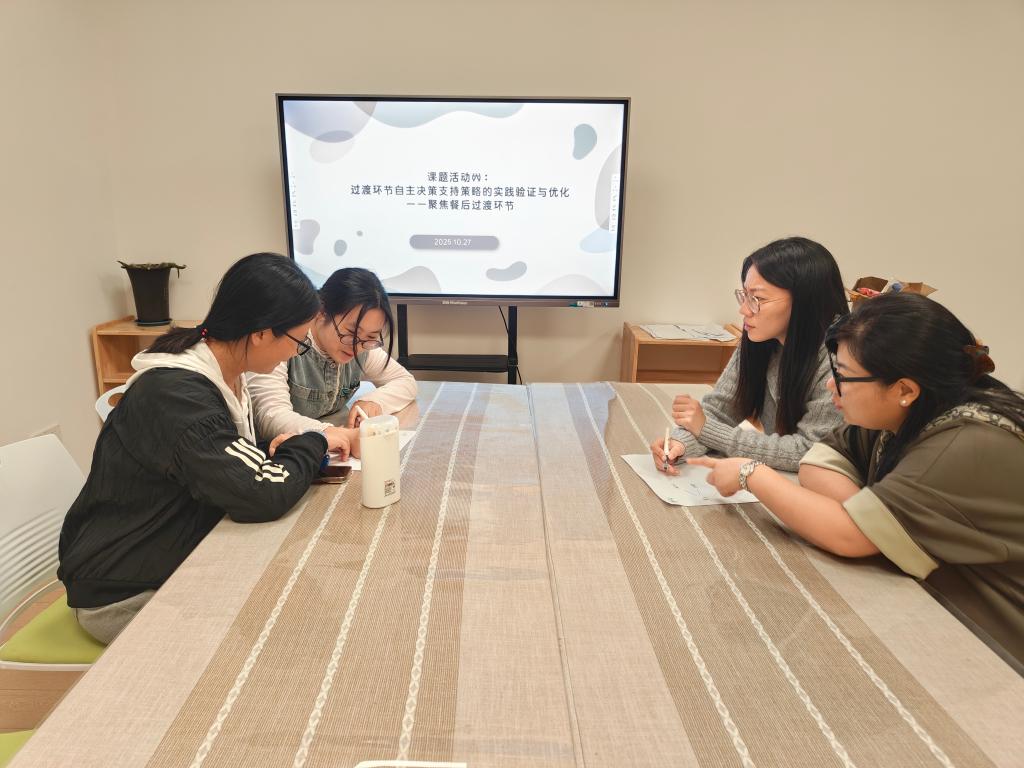 通知公告 More+ ● 太仓市科教新城幼教中心-复游城幼儿园2023-2024第二学期收费... 当前位置: 首页 >> 科研天地 >> 课题管理与活动组织 >> 县市级微型课题 >> 正文 过渡环节自主决策支持策略的实践验证与优化——复游城幼儿园开展课题研讨活动 2025-10-27 16:41 周娅 过渡环节自主决策支持策略的实践验证与优化——复游城幼儿园开展课题研讨活动 为进一步验证过渡环节自主决策支持策略的实践有效性,10月27日下午,复游城幼儿园《一日活动的过渡环节中培养幼儿自主决策能力的策略研究》课题组在会议室开展专题研讨活动。本次活动由课题组主持人周娅牵头,全体成员围绕餐后过渡环节的策略优化展开深入研究,通过系统观察与问题诊断,破解“时间碎片化”“空间交叉干扰”等场景矛盾,推动自主决策支持策略的场景化落地。 活动开始,课题组回顾了9月《餐点后游戏菜单》等策略的试行成效,明确本次研讨需从材料、时间、空间三维度验证策略适配性。接着,全体成员分为三组深入班级观察,重点记录幼儿在材料选择、时间规划及规则遵守等方面的行为表现。观察发现,各餐后环节普遍存在材料数量不足引发争抢、幼儿时间规划意识薄弱、空间功能重叠导致交叉干扰等问题,如午餐后值日生分工不明确、午点后女生梳头等待时长差异显著等。最后,结合观察数据,课题组从材料动态补给、时间弹性管理、空间功能重构三个维度深挖成因,通过分组研讨与集体共创,形成“材料共享漂流站”“弹性时间沙漏制”“空间轮换预约制”等优化策略,最终修订完成《餐后自主决策支持策略操作指南》,为全园推广提供可操作依据。 此次研讨通过“分环节观察—多维度归因—协同策略优化”的行动研究闭环,不仅有效破解了餐后过渡环节的现实矛盾,更推动教师从“决策主导者”向“支持引导者”转变。下一步,课题组将在各班级试点优化策略,持续跟踪幼儿自主决策行为变化,探索将餐后环节经验迁移至入园、离园等过渡场景,逐步构建覆盖全园的自主决策能力培养体系,让过渡环节真正成为幼儿自主成长的“实践场”。 【关闭窗口】 园长信箱 教学频道 家长学校 每周食谱 特色花絮 微信公众号